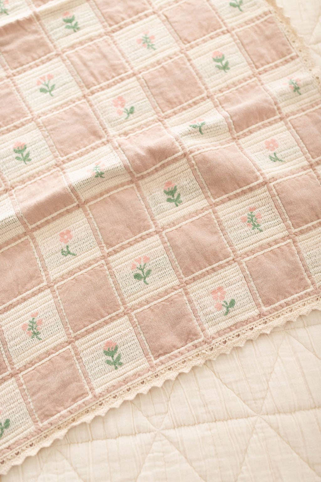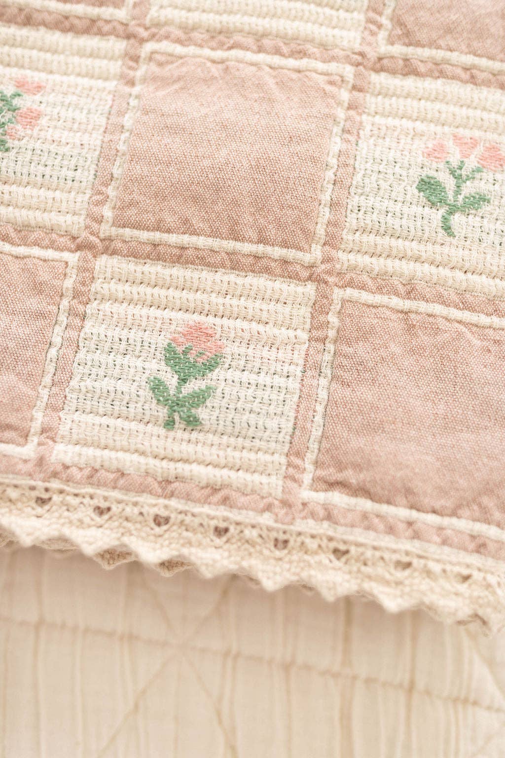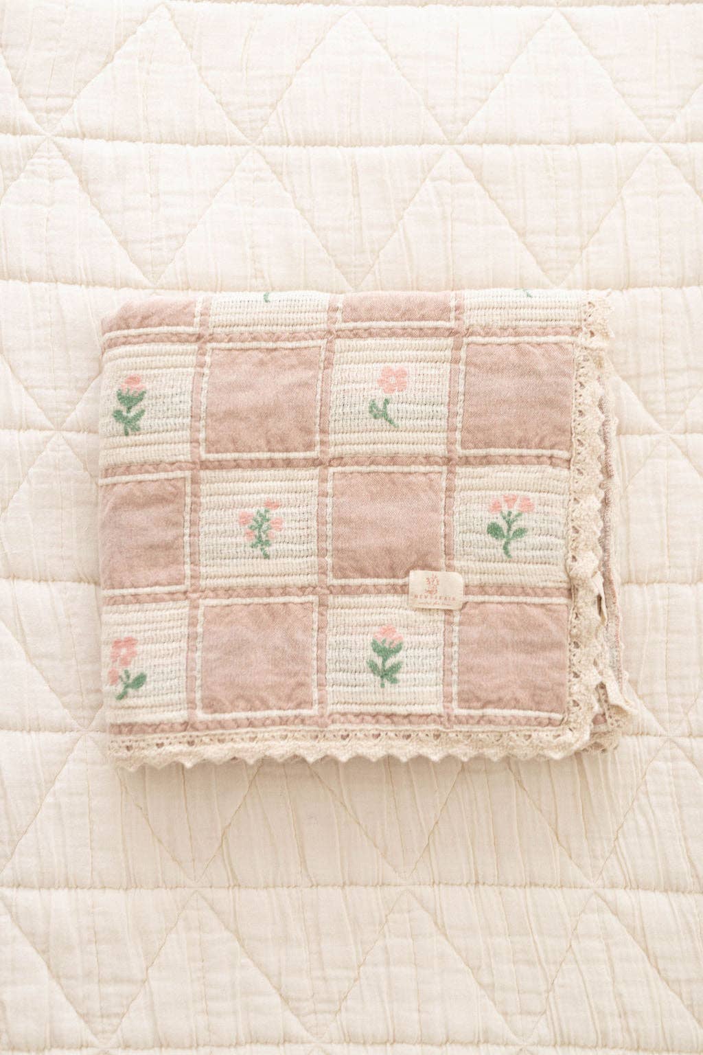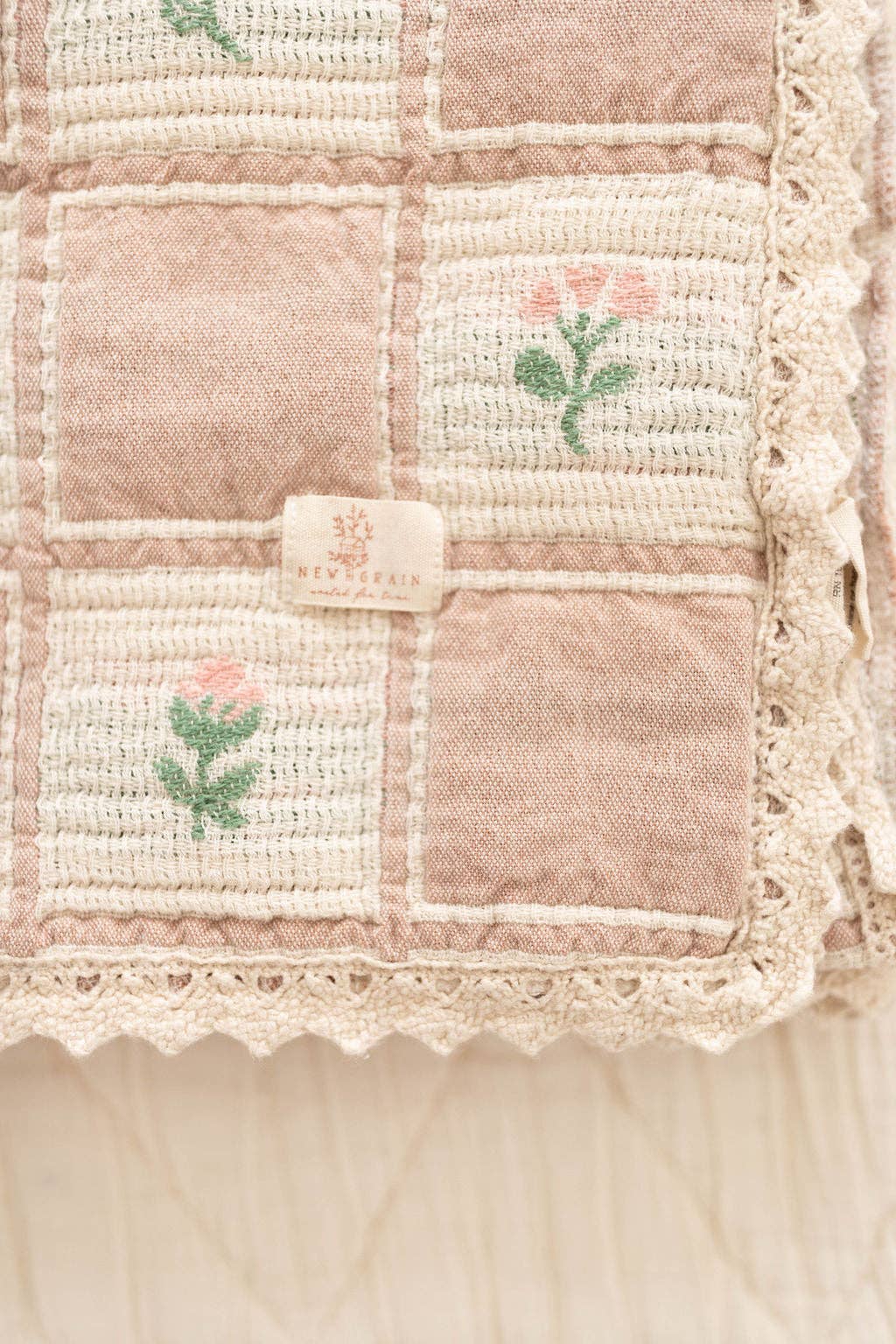 Add the perfect vintage-inspired, heirloom-quality piece to your baby's nursery with the patchwork fleur blanket by New Grain. This floral blanket features milk and petal patchwork squares with flowers in petal pink. It measures 32 x 42 inches and is made of 100% organic cotton.