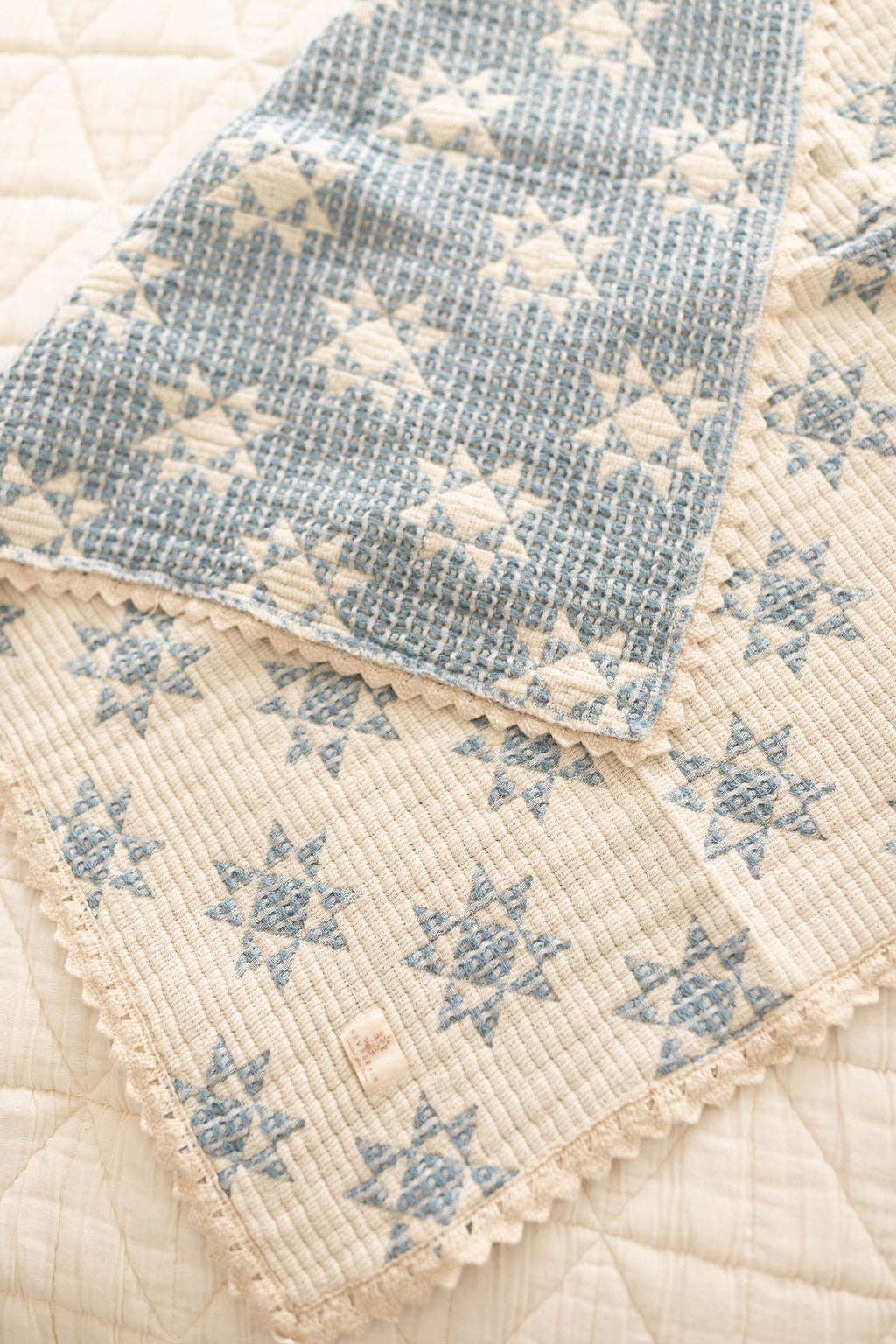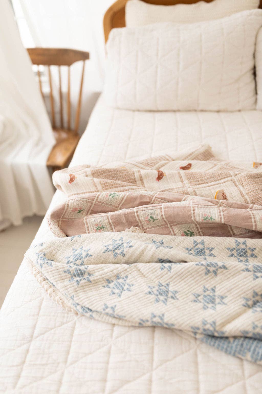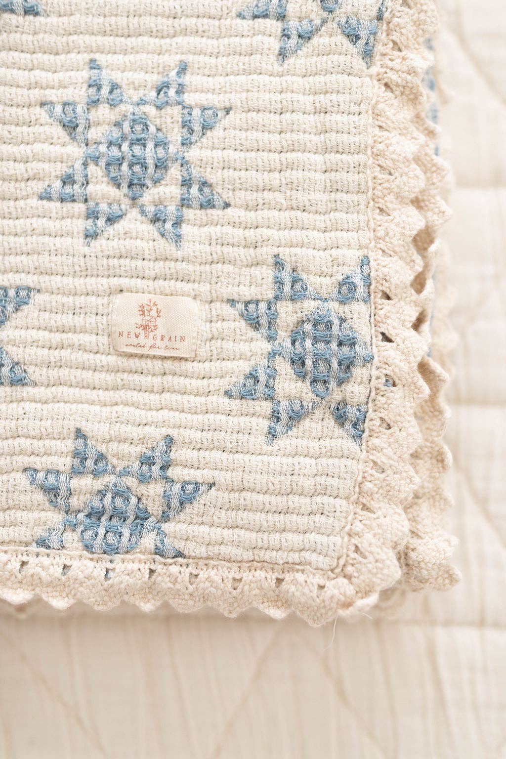 Add the perfect vintage-inspired, heirloom-quality piece to your baby's nursery with the star quilt in sky by New Grain. The quilt features sky blue stars against a powder background and has a crochet trim. It measures 32 x 42 inches and is made of 100% organic cotton.