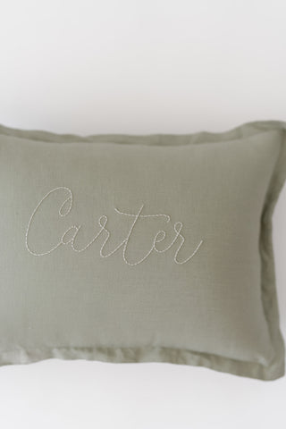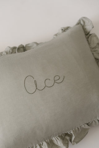 sage pillow + white thread + font F
