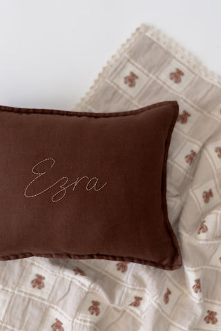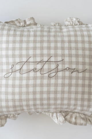 beige gingham pillow + chocolate thread + font B