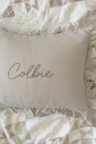 cream pillow + driftwood thread + font D