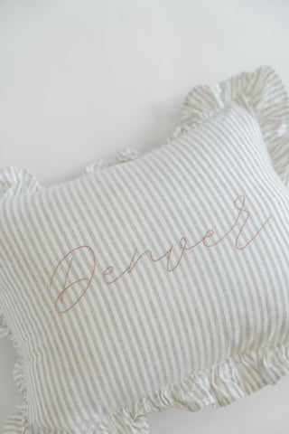 khaki pillow + blush thread + font d